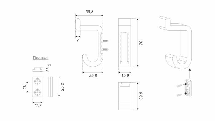 двухрожковый крючок скрытого монтажа из алюминия универсального минималистичного дизайна.