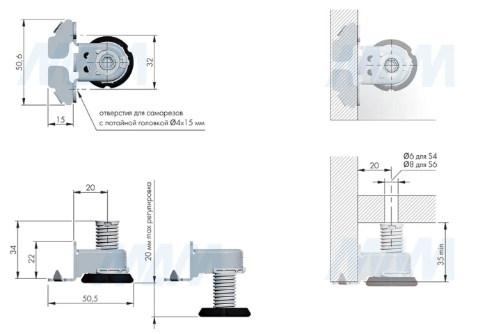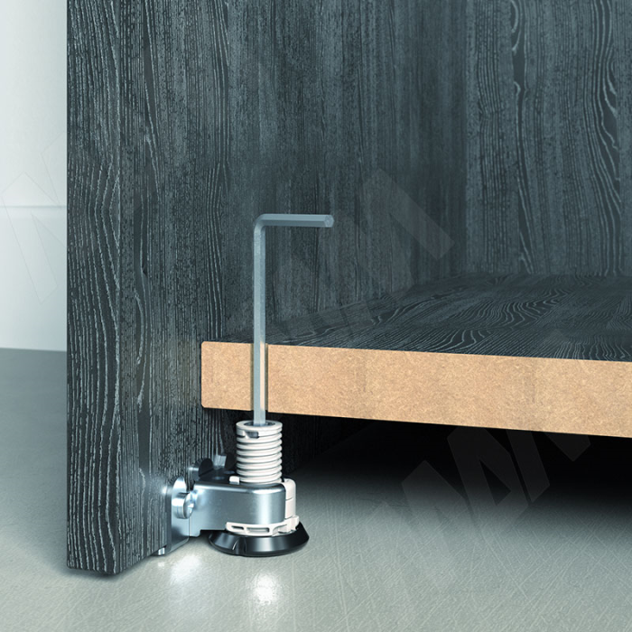 Применение: обновлённый вариант опоры INTEGRATO, предназначенной для компенсации неровности пола и выравнивания высоты тяжелых гардеробов, шкафов и корпусной мебели с цокольной конструкцией