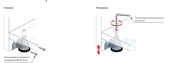 регулировка осуществляется через отверстие ∅6 или 8 мм, просверленное насквозь в дне конструкции, шестигранными ключами 4 или 6 мм;