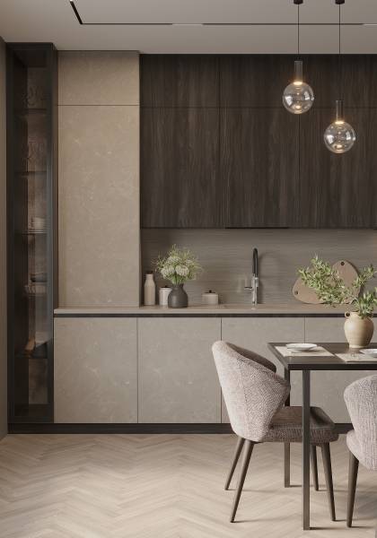 Авелано — для тех, кто ценит первозданную красоту дерева. Этот декор обладает выраженным рустикальным характером. Он идеально сочетается со светлыми однотонными фасадами и необычными фантазийными текстурами, создавая уютный и при этом современный контраст.